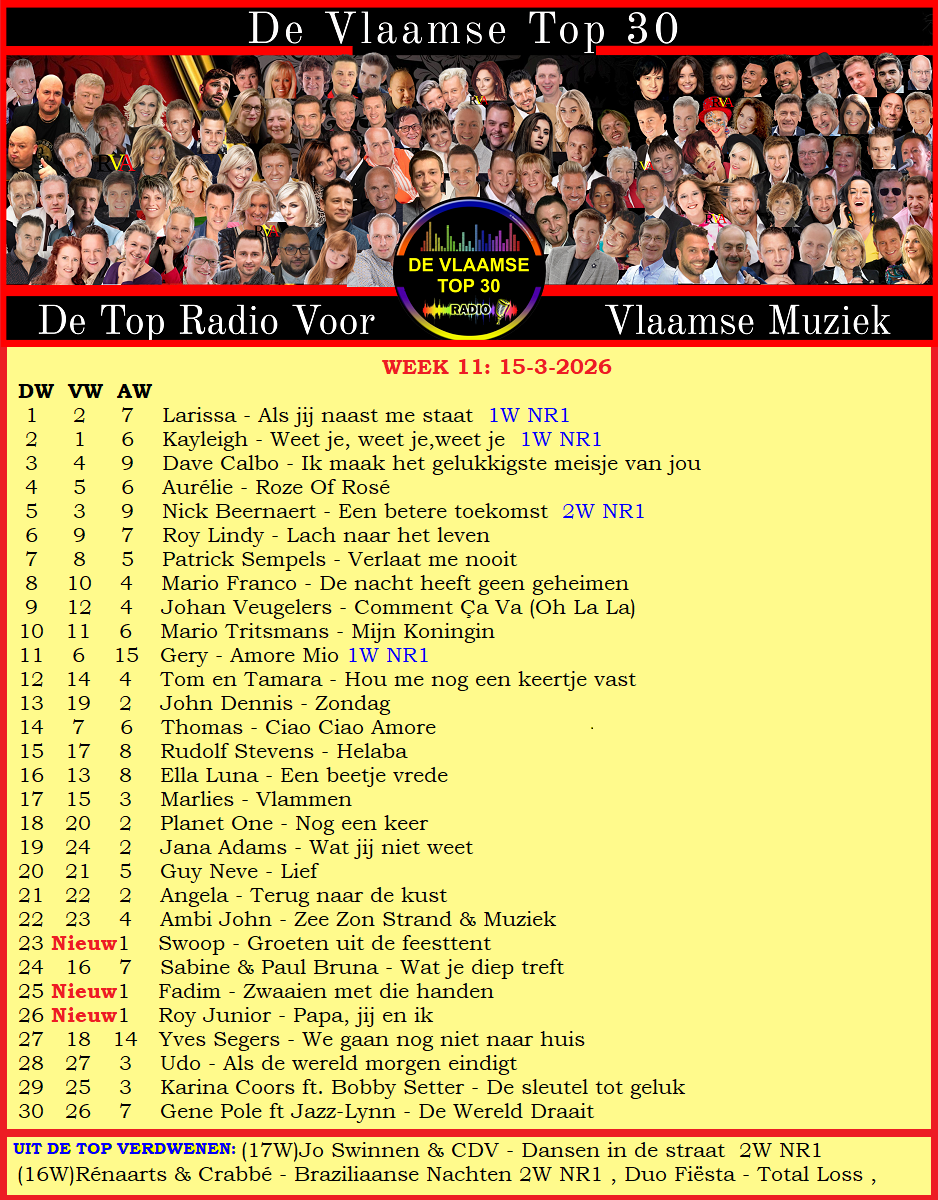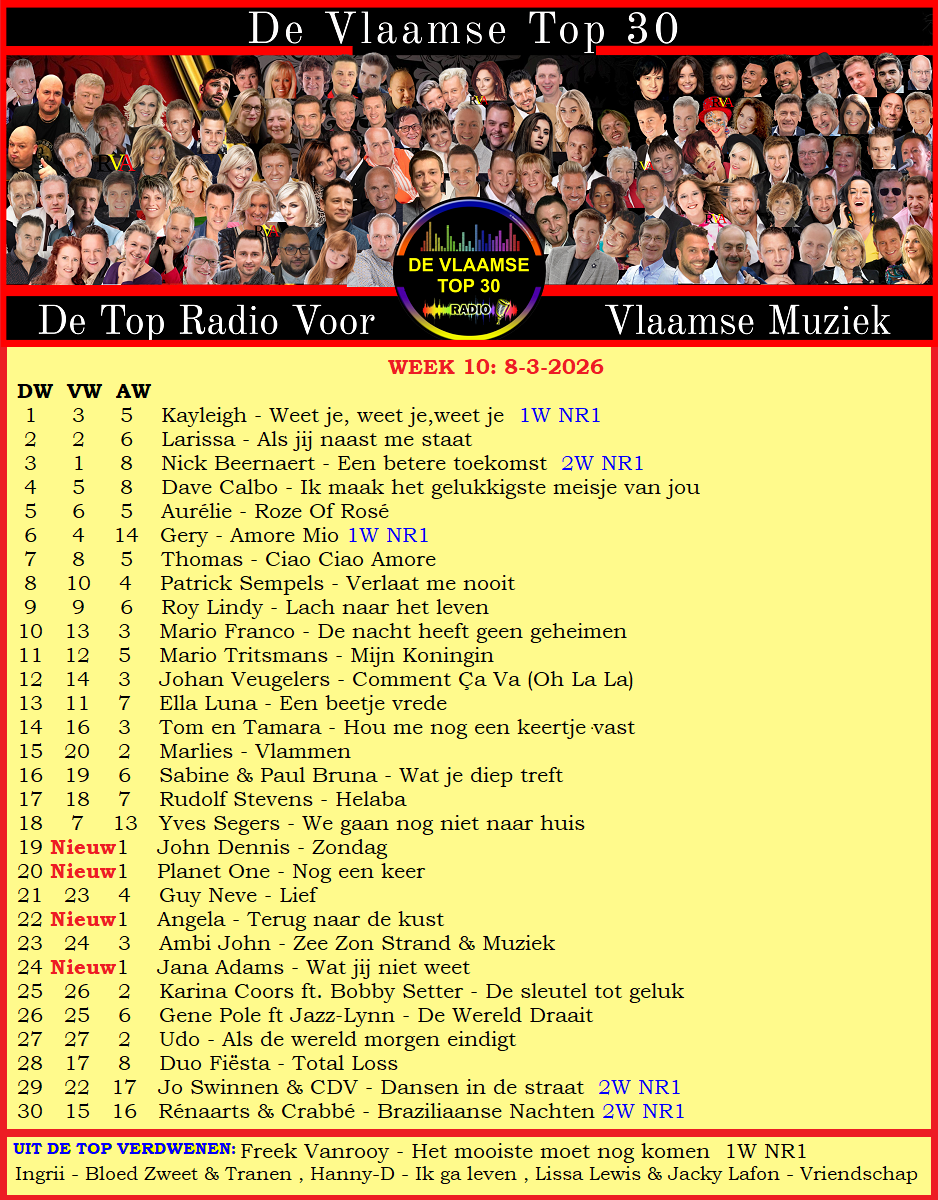 Hier de uitslag van www.devlaamsetop30.be van zondag 8-3-2026