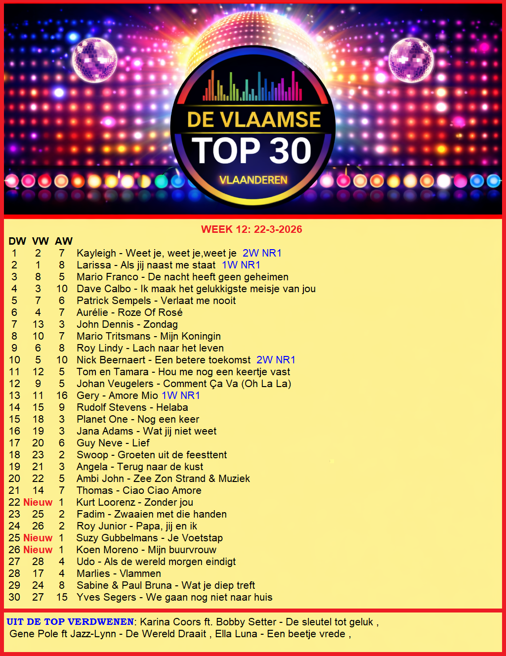 Hier de uitslag van www.devlaamsetop30.be van zondag 22-3-2026