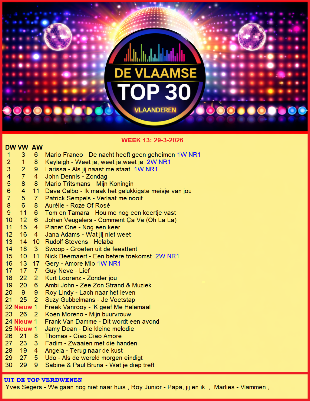 Hier de uitslag van www.devlaamsetop30.be van zondag 29-3-2026