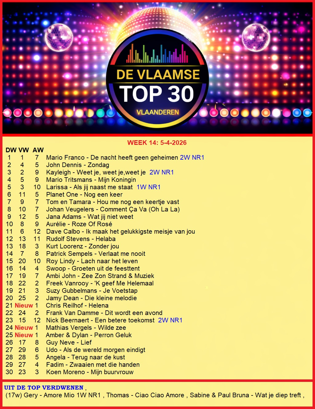 Hier de uitslag van www.devlaamsetop30.be van zondag 13-4-2025