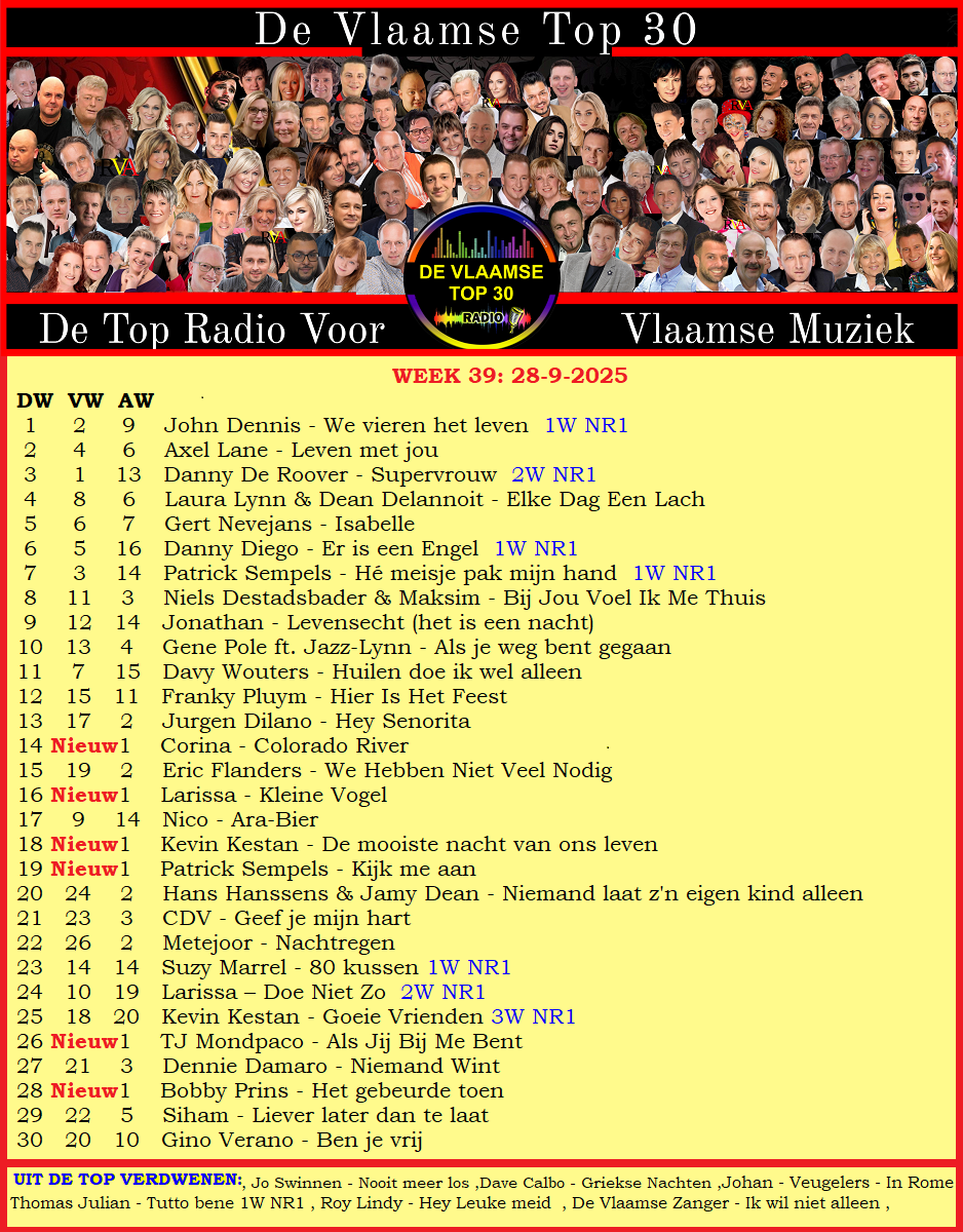Hier de uitslag van www.devlaamsetop30.be van zondag 28-9-2025