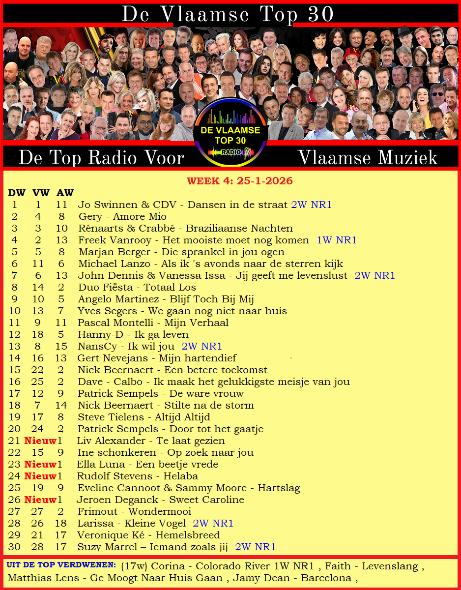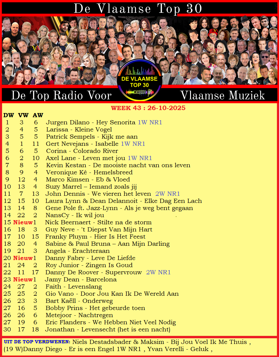 Hier de uitslag van www.devlaamsetop30.be van zondag 26-10-2025