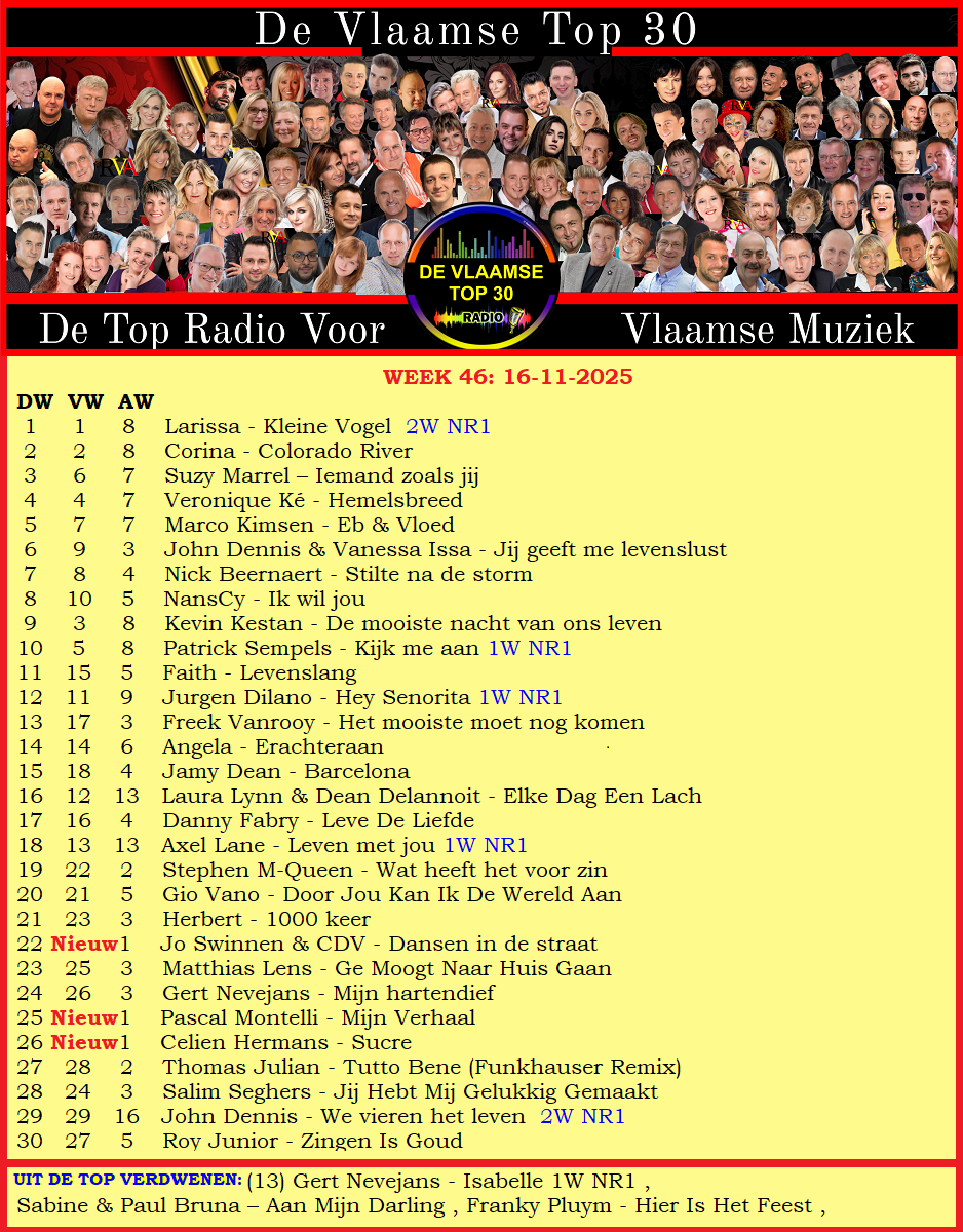 Hier de uitslag van www.devlaamsetop30.be van zondag 16-11-2025