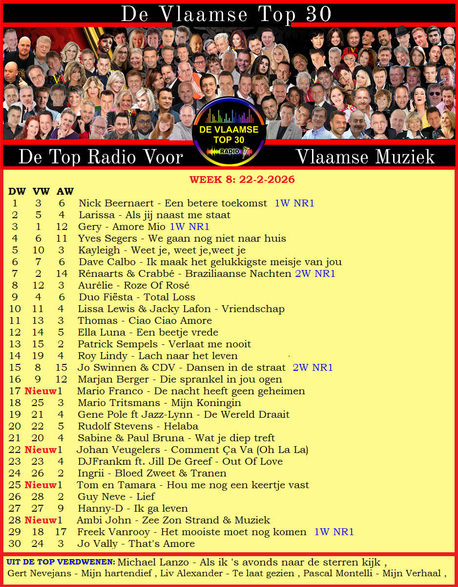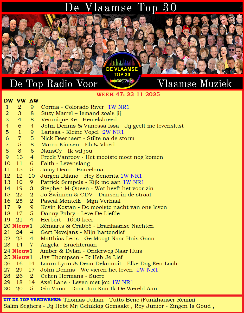 Hier de uitslag van www.devlaamsetop30.be van zondag 23-11-2025