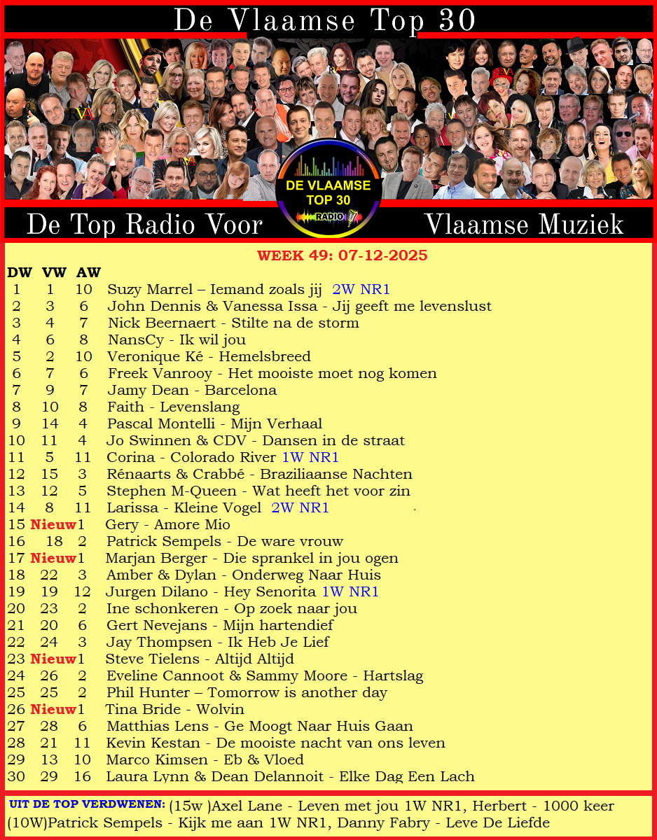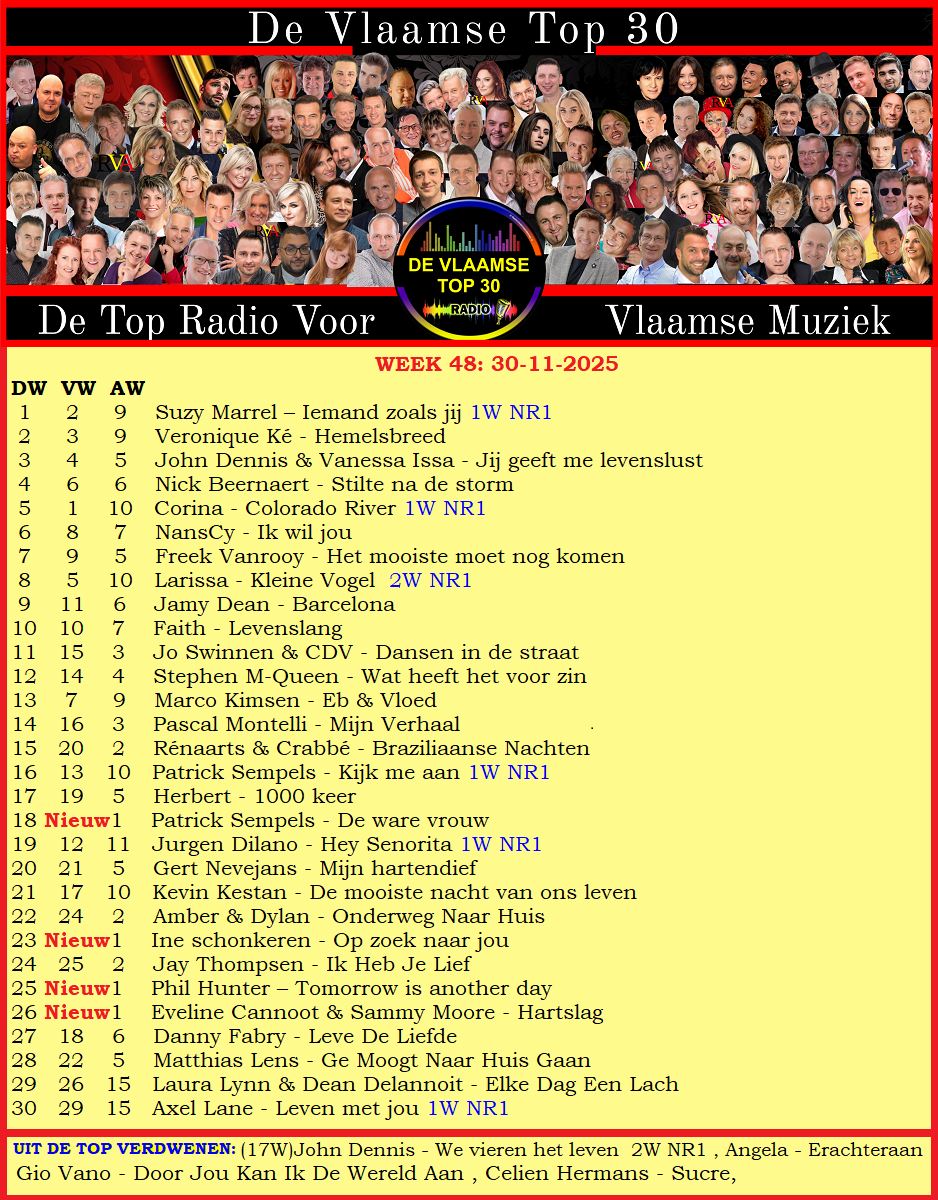 Hier de uitslag van www.devlaamsetop30.be van zondag 30-11-2025