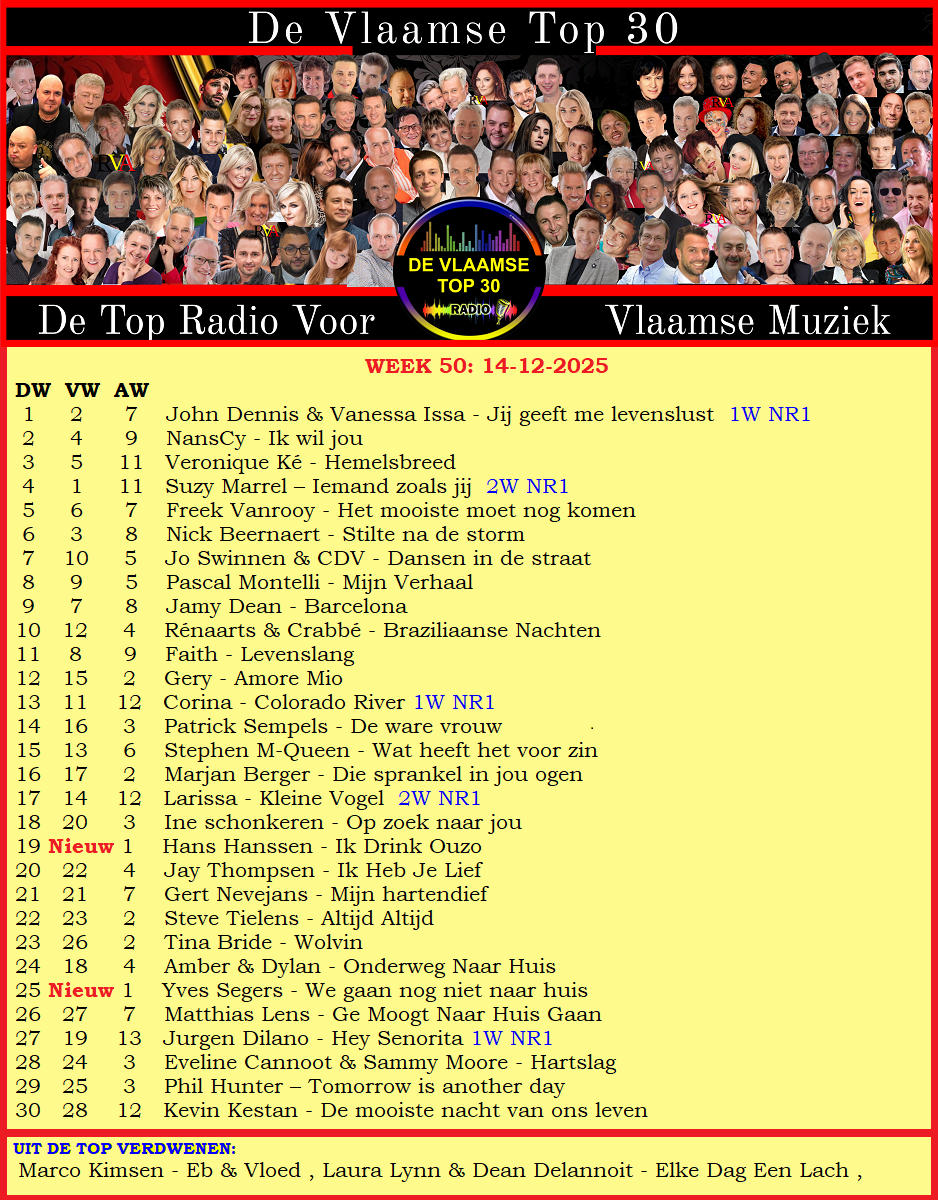 Hier de uitslag van www.devlaamsetop30.be van zondag 14-12-2025