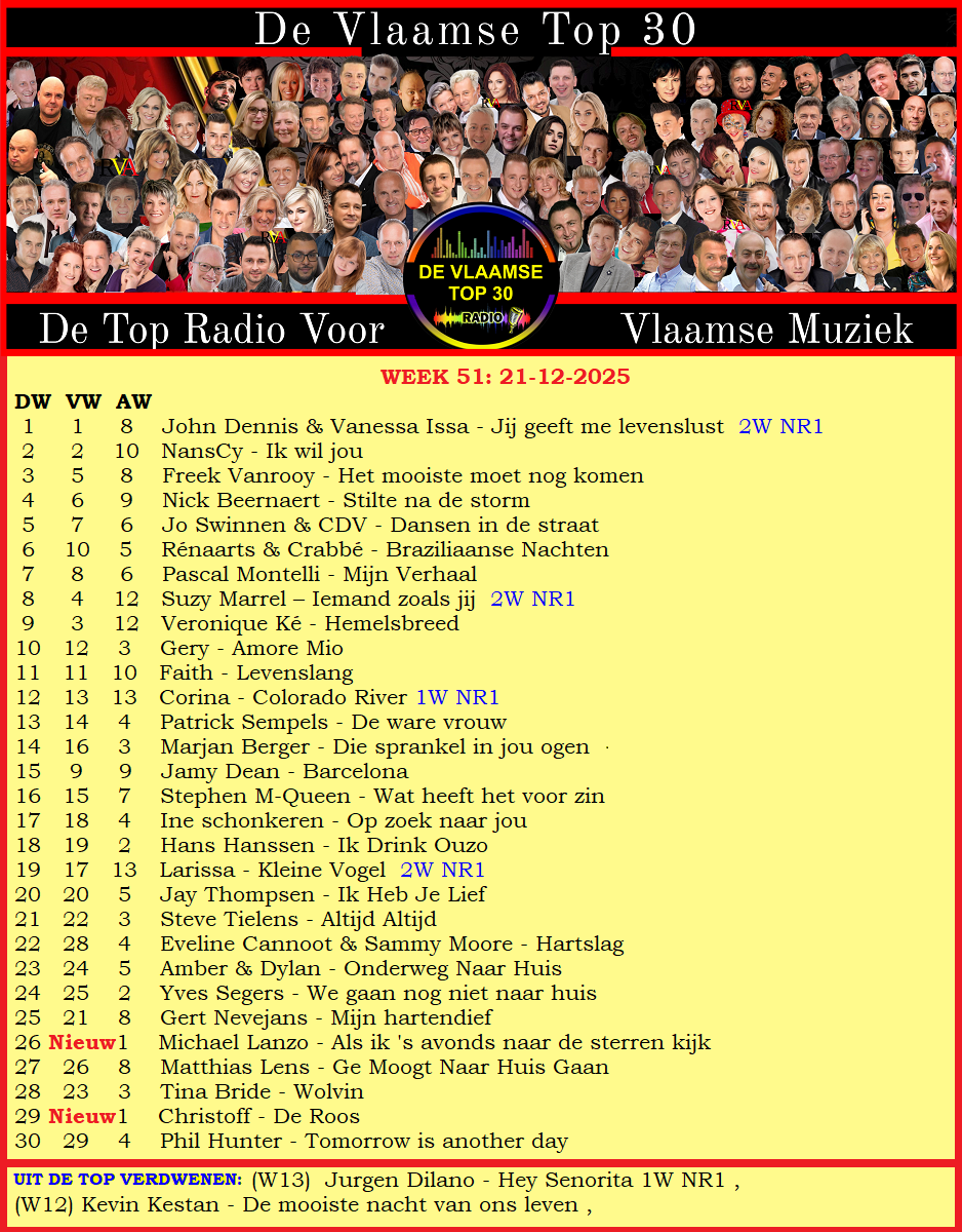 Hier de uitslag van www.devlaamsetop30.be van zondag 21-12-2025